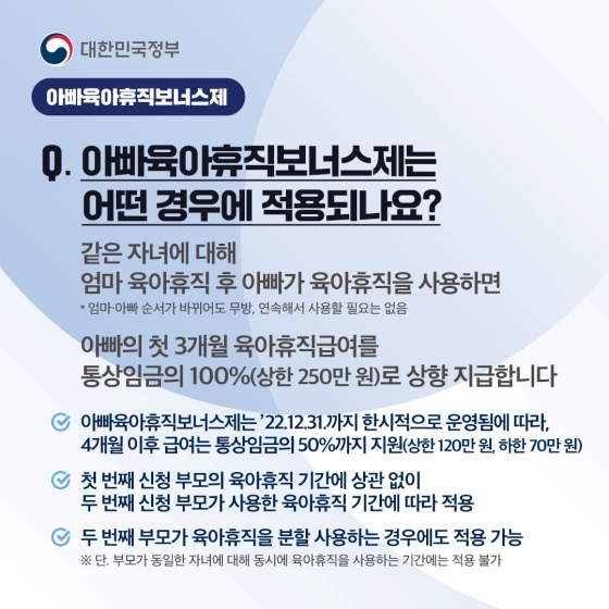 위 제도 외에도, 기존 ‘아빠 육아휴직 보너스제’도 유지됩니다. 동일 자녀에 대해 엄마가 먼저 육아휴직을 사용하고, 아빠가 1년 이내에 육아휴직을 시작하면 아빠는 첫 3개월 동안 통상임금의 100%를 지급받을 수 있으며, 월 최대 300만 원까지 적용됩니다.