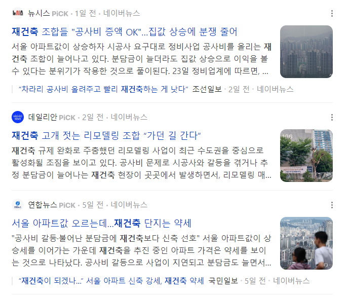 오늘 '재건축'이라고 검색하면 아래와 같은 뉴스가 나왔다.