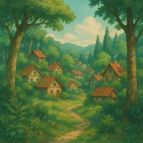 “지브리 스타일의 숲속 마을 풍경을 그려줘”