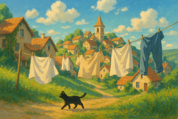 “지브리 스타일의 언덕 위 마을, 따뜻한 햇살, 바람에 날리는 빨랫줄, 고양이가 걷고 있는 장면 그려줘”
