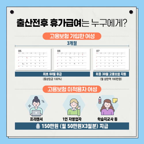 출산일 기준으로 고용보험 자격이 유지되지 않아도 가능하며, 고용센터에 본인이 직접 신청하면 됩니다. 다만, 이 경우에는 고용보험에서 60일간의 급여만 지원되며, 회사 부담분은 없습니다.