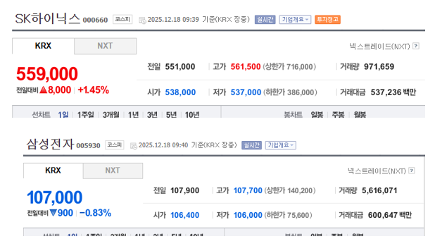 이 글을 쓰면서 보니 지금 SK하이닉스는 559,000원을 기록하고 있고, 삼성전자는 107,000원을 기록하고 있다.
